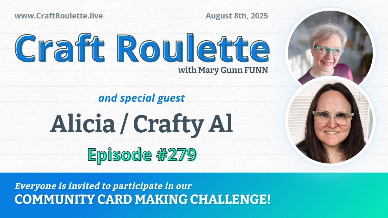 Craft Roulette episode 279, hosted by Mary Gunn FUNN on August 8, 2025, featured special guest Alicia / Crafty Al. The project parameter was a Kid’s Card, with a color parameter of Theater, an element parameter of Picture(s), and a random parameter of 1/2 & 1/2.